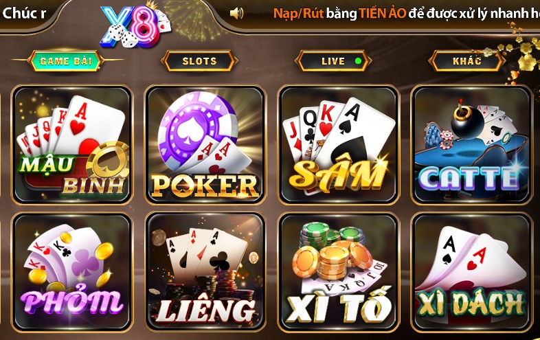 X8 không chỉ cung cấp các trò chơi quốc tế mà còn mang đến những game bài quen thuộc và yêu thích của người Việt như Tiến Lên, Liêng và Mậu Binh. Mỗi trò chơi đều mang một nét đặc trưng riêng, đầy kịch tính và hấp dẫn. Với luật chơi rõ ràng và tính chiến thuật cao, đây là những trò chơi lý tưởng để thư giãn cùng bạn bè hoặc thử sức với những đối thủ trực tuyến từ khắp nơi.